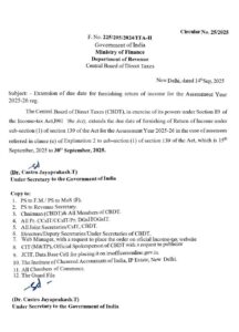 विवेक झा, भोपाल। आयकरदाताओं के लिए राहत भरी खबर सामने आई है। केंद्रीय प्रत्यक्ष कर बोर्ड (CBDT) ने आकलन वर्ष 2025-26 के लिए आयकर रिटर्न दाखिल करने की अंतिम तिथि बढ़ा दी है। पहले यह समयसीमा 15 सितम्बर 2025 तय की गई थी, जिसे अब बढ़ाकर 30 सितम्बर 2025 कर दिया गया है।
